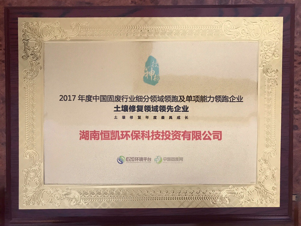 12月15日,由E20环境平台和中国城市建设研究院共同主办的“2017(第十一届)固废战略论坛”正式在北京开幕,本次论坛现场揭晓了2017年度(第九届)中国固废行业企业评选结果,恒凯环保荣获2017年度中国固废行业细分领域土壤修复领域领先企业奖。