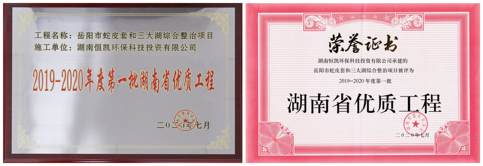近日,由恒凯环保参与建设的岳阳市蛇皮套和三大湖综合整治项目被评为“湖南省优质工程”。这是该项目继获评2019年度岳阳市优质工程之后,获得的又一殊荣,既是政府和社会各界对公司工程质量的高度认可,也为公司以质量取胜、以信誉立足市场打造行业精品工程锦上添花。