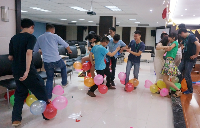 随着节奏紧凑的音乐响起,每个人脚上绑的气球似乎都变得紧张起来。在“踩气球”这个游戏环节,既要保护自己的气球,又要想办法踩爆其他人的气球,最后一个气球没被全部踩爆的人获胜。一声令下,尖叫声、气球爆炸声、欢呼声同时响起,每个人都玩的不亦乐乎。最后工程部吴平获得胜利,赢得了奖品。其他的寿星也领到了我们精心准备的生日礼物。