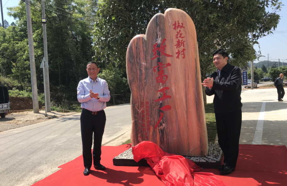 ▲长沙市人民政府副市长邱继兴和青竹湖建设董事长胡准为椒花新村“致富工厂”揭牌
